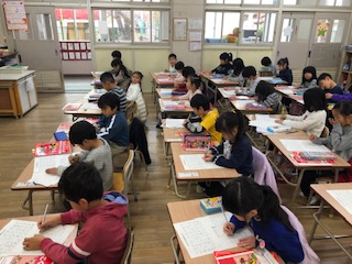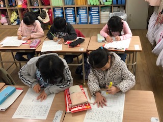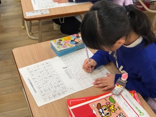 子どもたちはカタカナを学びます!五十音順に一文字一文字丁寧に書き写しています。はじめのプリントが終わった子どもたちは、別の練習用紙で重ねて学びます。繰り返しが大事ですね!