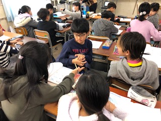 子どもたちはわかるけど説明が難しいと悩んでいます!一人で無理なら、近くの人と!話し合いが続きます!