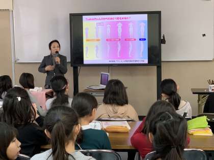 下着会社の方をゲストティーチャーに招き、成長期の女の子の体形変化や下着の選び方、25年前と今の子どもの体形の違いなど研究されてきたことをもとにともに学びました。また、その後は大人向け研修会!「学校で子どもたちが学んでいる性(生)教育ってどんなこと?」と保護者の方から素直な疑問を投げかけられ、実現したこの学び!水野養護教諭が子どもたちに語りかける生きた学びを、保護者の方々と共有しました。参加された方から「こんなふうにして、子どもたちは学んでいるんですね。知ることができてよかったです!」とうれしい言葉をもらいました。まさに、大人も学びの主人公です!