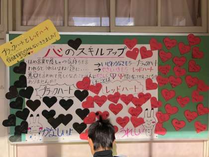 保健室前の廊下掲示板に、赤と黒のハートの花が咲いています。