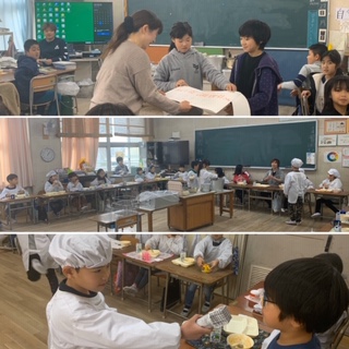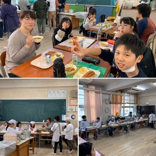 昨日の「給食調理員さんと給食を食べよう!」の招待チケットを抽選でゲットした2つのクラスに、調理員さんたちがお邪魔してランチタイムを過ごしました。