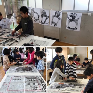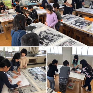 インキをねる、インキをつける、枠に合わせてオニを置く、てのひらでする、すり紙をおく、すり紙をぬってほす、とやり方の手順を確認してからの作業のため、とてもスムーズに授業が流れました。新聞紙に赤い線で枠をしたのは、とても良い工夫でした!