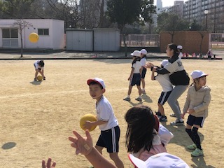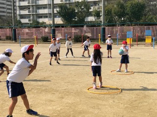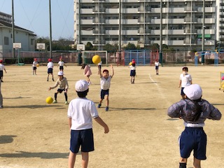 なんとなく春を感じさせる陽気の運動場では、子どもたちが楽しそうに学んでいました!ドッジボールは相手コート内に味方のエリアのある変わったルール!子どもたちはキャーキャーいいながら逃げたり、当てたり!大はしゃぎ!