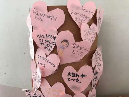 これ、「レッドハートの木」だそう!子どもたちがレッドハート(あったかい優しい心)の気持ちを書き記したものでした!