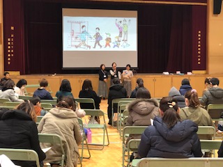 「学校はあるもの?それとも、つくるもの?」といきなりの問いかけに新1年生の保護者のみなさんは戸惑いの様子。