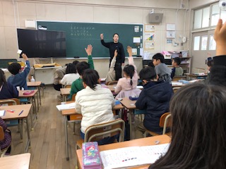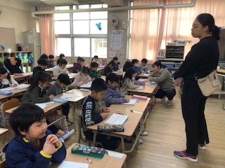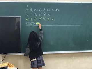 実際にノートに丸を描きながら、この問いを図式化します。子どもたちは視覚的に問題文を捉えて、みんなで何人を考えました。どの子も上手に丸を描いていました!