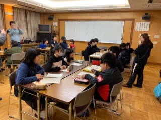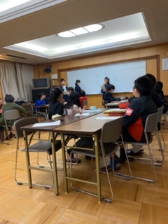 4つのグループに分かれ、中学生の先輩に自分の考えを伝え、しっかり話し合っていました!