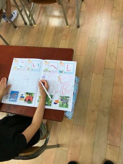 その次は、ひらがなの「い」と「こ」の文字を書く練習をしていました。