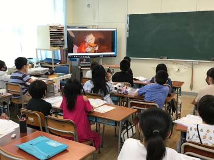 写真を見ると、子どもたちがテレビからの映像と音に集中している様子がよくわかりますね。
