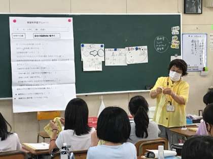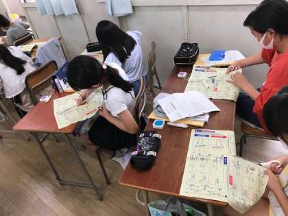 5年生の家庭科の授業で、針に糸を通すのと、布を断つ練習を行っていました。
