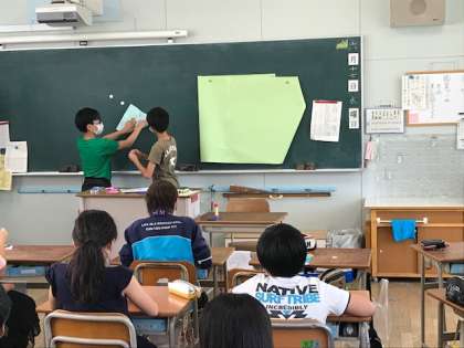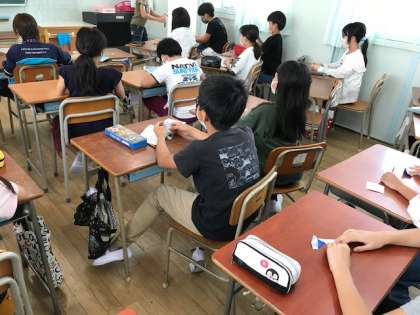 昨日の5時間目、6年生では前に出ている児童が学級のみんなに折り紙の折り方を順序立てて教えていました。