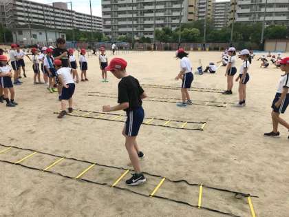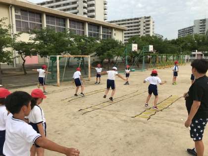 ロープはしごを使って、小刻みにステップをしたり、手と足のリズムをとっての運動を行っていました。