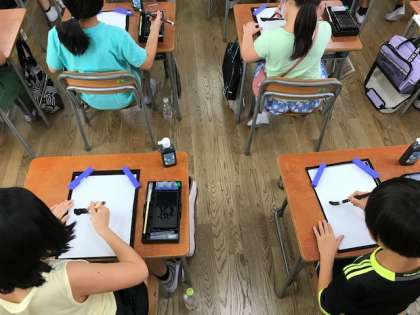 漢数字の「一」を題材として、筆の持ち方、紙に筆先をつけるときの置き方、筆を上げるときの止め方、など基本的なことを練習していました。