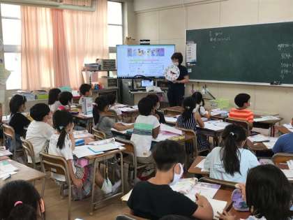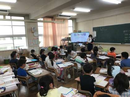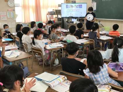 2年生の算数で時計の時刻を見て、その時間は何をしているときか発表していました。