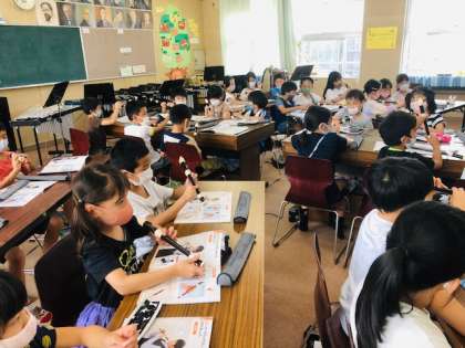 音楽科では、リコーダーの指の使い方の確認をしたり、楽譜を読む練習をしています。