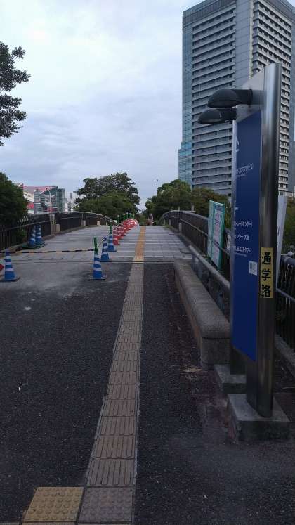 もうご存じかもしれませんが、中ふ頭駅とインテックス大阪方面をつなぐ陸橋(はばたきの橋)の橋梁補修工事が、8月27日から10月10日までの予定で始まっています。(9:00〜17:00昼間工事。現在、片側通路になっています)