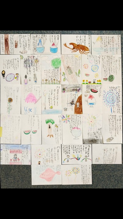 3年1組のみなさんが国語・書写・図画工作にもつながる取組で書いてくれた「残暑見舞い」の、かもめーる(葉書)が届きました。