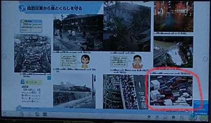 画面右下の住之江区の台風被害の写真をみて、一昨年の台風を思い出しているようでした。白黒の古い被害写真では、「戦前のころの話かな?」と社会科の教科書を取り出したり、『わたしたちの大阪』(副読本)を出してきて関連資料がないか調べたりする児童もいて、今までの学習内容と結びつけながら学んでいました。