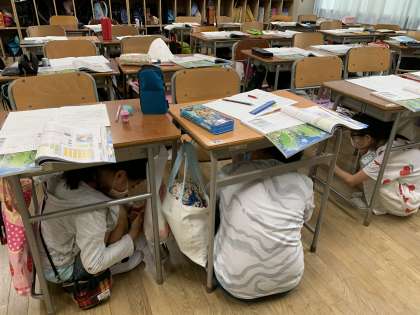 また、先週は、大阪880万人訓練があり、5年生でも、机の下に隠れる練習をしたり、避難の仕方や防災・減災につながる話をしたりしました。
