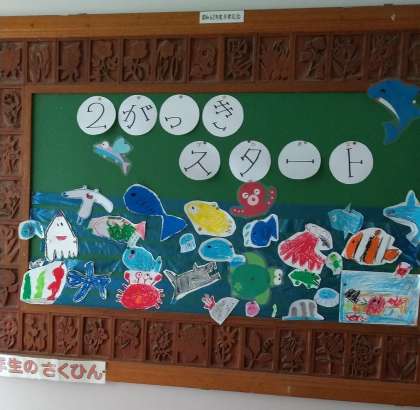 「2がっき スタート」・「まいにち げんきに すごそうね」と題して、1年生教室と保健室との間の廊下に掲示しています。