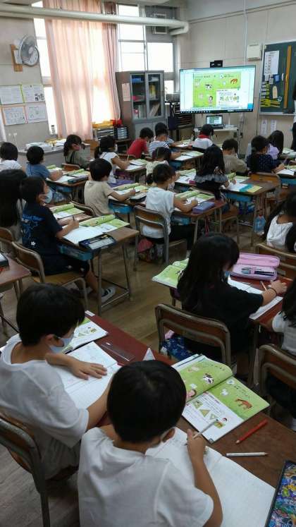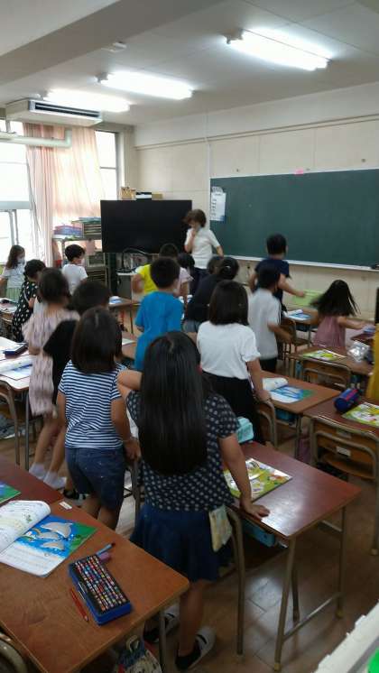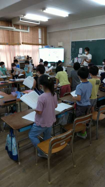 国語の授業では、全員が気持ちを一つにして、今する学習活動に集中できるようにと、立ち上がる場面も取り入れて、みんなで大きな声で、声を合わせて教科書を読んでいました。とても楽しそうでした。