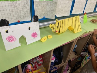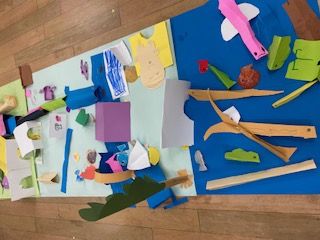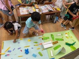 「海」「土」「草原」の3種類の画用紙の上に、いろんな動物や建物をおって、たてることができていました。子どもたちも「あっ、これは魚だ!」「ここにトンネルをつくったから乗り物を作ろう!」など、話し合いながら楽しんで取り組んでいました。