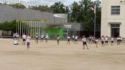 運動場では2年生のみなさんが「フラフープ」に挑戦です。コツをつかんで1分間近く回し続けている児童もいました。