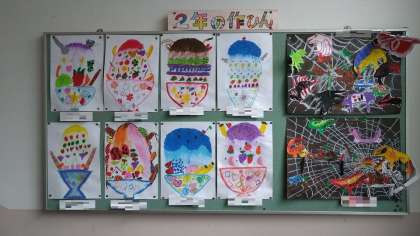 夏休みの課題作品の一部が、階段踊り場の掲示板に飾られていました。