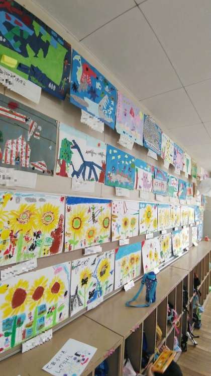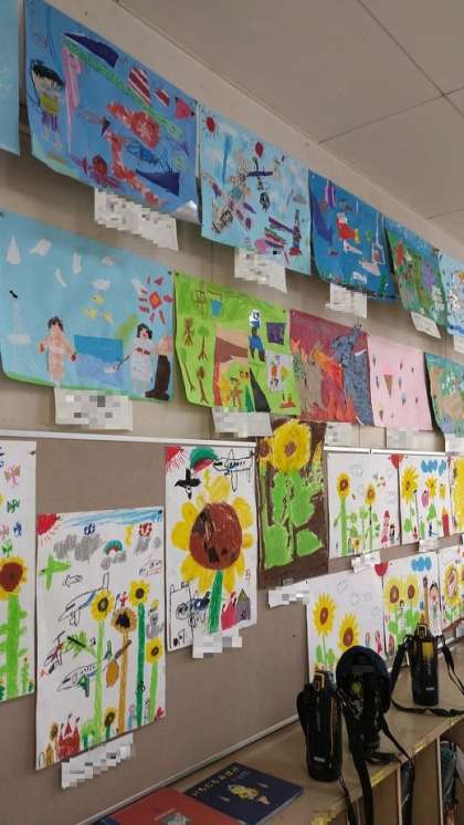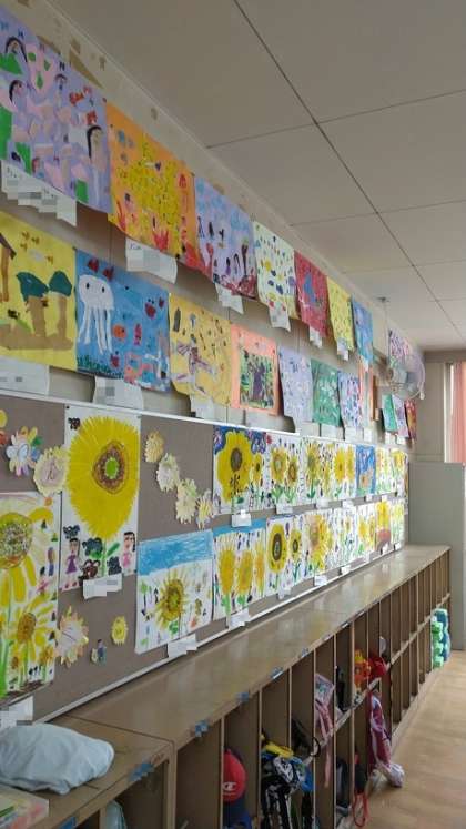 1年生の教室には、前回の課題の「ひまわり」の絵を中心に、夏休みの作品もあわせて掲示されていました。