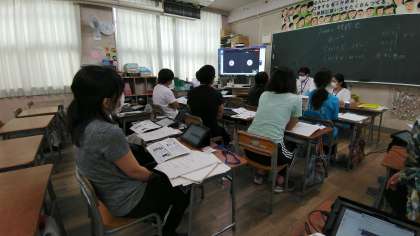 密を避けるために複数教室に分かれての研修で、教員が各家庭の児童であるとの見立てでオンライン授業(Teamsを用いたビデオ会議)に参加したり、また指導者としての立場での便利な操作法を学び、自校での活用方法を考えました。