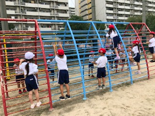 今日の土曜授業では、初めて遊具を使いました。ジャングルジムや鉄棒、うんていなど学校の遊具の使い方について学びました。「先生、最後までうんていができたよ!」「逆上がりできた!」など、すごく楽しんで取り組んでいました。