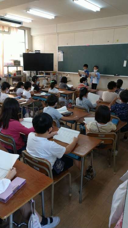 朝の児童集会のあとの時間を使って、2年生が音読活動をしていました。語のまとまりや響きに気をつけて読み上げます。