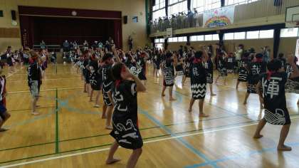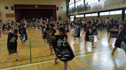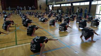 当日は、台風14号の影響であいにくの雨となり、講堂(体育館)で「南中ソーラン」の披露のみとなりました。3密を避けるために、保護者の参観は学級毎となり、子どもたちは、3公演を連続して行うことになりました。3公演とも集中力が途切れることなく、精一杯にやり切ってくれました。
