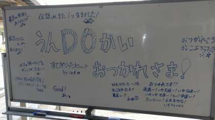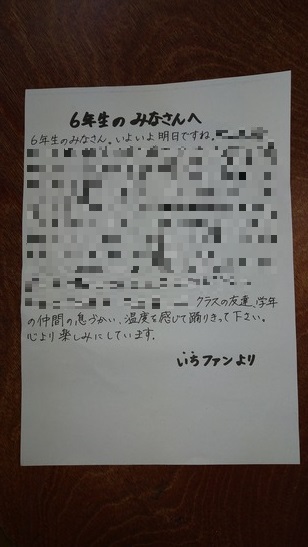 3公演が終わった後に見てもらえるように、ねぎらいの言葉がホワイトボードにしたためられ体育館入り口に設置されました。あとで知ったことですが、前日に、ある先生から心のこもった励ましの手紙が6年生に届けられていました。