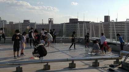 今日は、「大きなシャボン玉をつくろう」をテーマに、校舎屋上で活動していました。