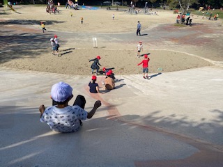 住之江公園に到着!巨大すべり台やアスレチックで遊んだり、貝殻を拾ったりしました。「一緒にすべろう!」「たくさん貝殻を見つけたよ!」など、汗をかきながらとても楽しんでいました。