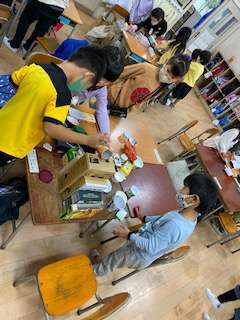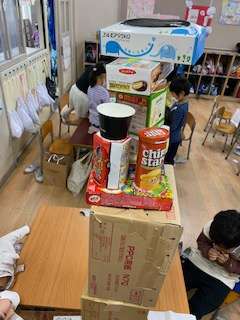 今日の1年生は、算数科で「かたちあそび」をしました。家から持ってきた箱を使って、どんなかたちが転がるか試したり、高く積むにはどうしたらよいか考えたりしました。どのグループも協力して図形に親しみ、楽しむことができました。
