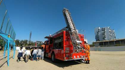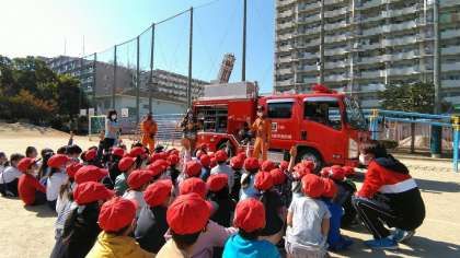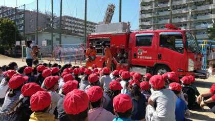 住之江消防署からレスキュー車で救助隊の方々に来ていただき、火災発生を想定した避難訓練を実施し、5分以内に全学年が運動場に避難完了することができました。