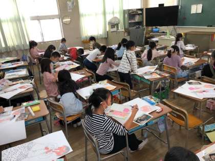 図工では、「リコーダーをふく自分」を描いています。みんな絵具で上手に顔を描くことができています。どんな作品が仕上がるのでしょうか。楽しみですね。