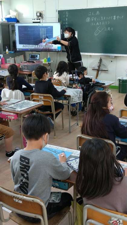 図画工作で版画制作をしています。前回まででカーボン紙で写し取り黒くマーカーで塗りましたが、本日は、塗った周りを三角刀で縁取るように彫り進めていきます。