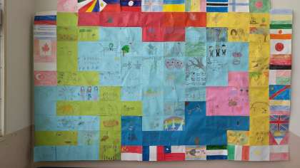 さて、写真の作品は、5年生フロアーへ上がる階段踊り場に掲示されていました。万国旗に囲まれ、ハトやオリーブ、デイジーの花などが描かれているカードを集めたものです。キッズ・ゲルニカと称して「平和」をイメージしたものを集めた5年生の取組です。