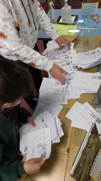 昨日から始まった「読書週間」ですが、おすすめの本を友だちなどに紹介する恒例の「図書郵便」の回収作業を図書委員さんが昼休憩に行っていました。