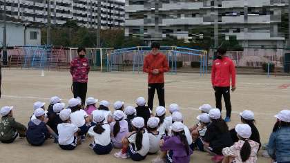 北京オリンピックメダリストのご存じ朝原宣治さんが主宰する陸上競技クラブの「NOBY T&Y CLUB」のみなさんで、オリンピアンの中村友梨香さんはじめ世界陸上やアジア大会などのアスリートの方々から直接指導を受ける夢のような授業でした。朝原さんも駆けつけてくださりご指導くださいました。住之江区役所の事業として大阪ガス(株)のご協力のもと実現しています。