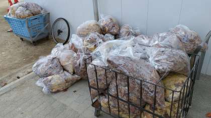 水気を含んだ落ち葉が重なり合うと滑りやすくなるため、銀杏などの落ち葉を回収しました。空き缶や自転車の車輪なども廃棄されていました。写真の通りかなりの分量です。