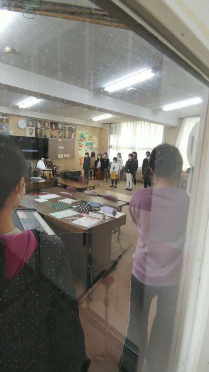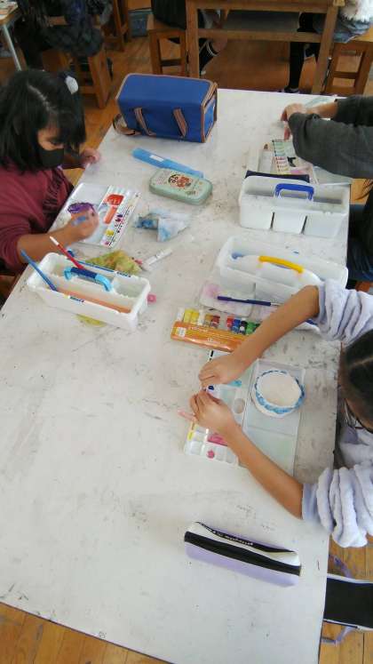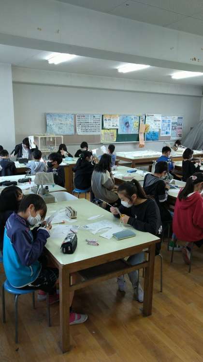 合唱風景を紹介用に撮影していました。理科室では、競技用紙飛行機を制作中。図工室では、紙粘土でつくったオブジェに彩色していました。