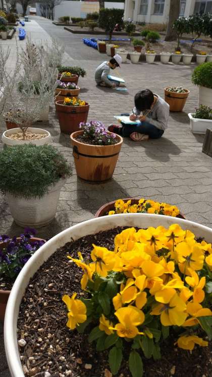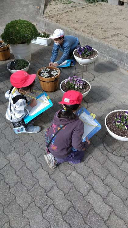 とても寒い日でしたが、日なたは暖かく、子どもたちは思い思いの場所で、せいかつカードにスケッチをしていました。