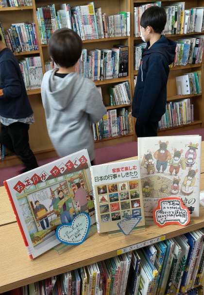 今日の館内は、お正月にまつわる図書がピックアップ展開されていました。
