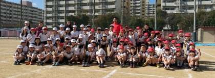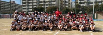 北京オリンピックメダリストのご存じ朝原宣治さんが主宰する陸上競技クラブの「NOBY T&Y CLUB」のみなさんのご指導で、朝原さんも駆けつけてくださり、直接指導を受ける夢のような授業でした。住之江区役所の事業として大阪ガス(株)のご協力のもと実現しています。