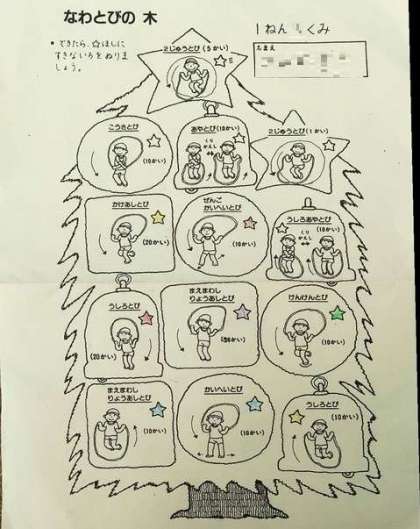 なわとび週間も明日までですが、1年生の体育の授業で子どもたちは、がんばっていました。成果を表に書き込みます。