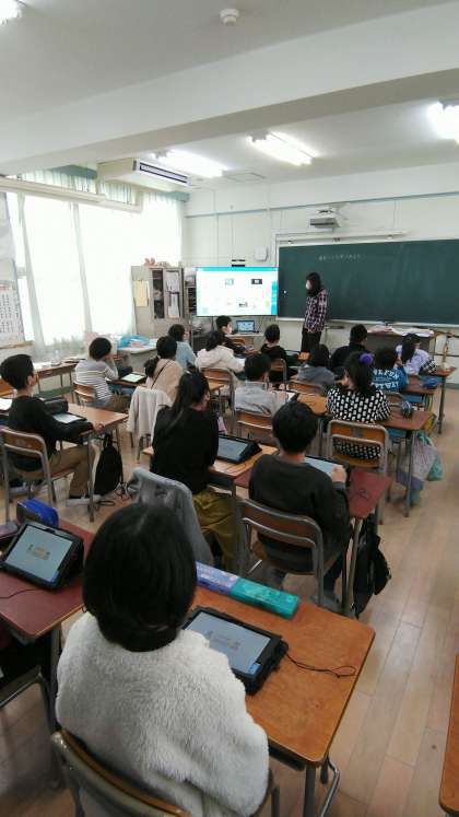 「宿題以外で家庭学習をしていますか」など、班ごとにアンケート調査結果をグラフ図表にまとめて発表する取組で、ツールとしてタブレット端末を用い、「エクセル」でグラフをつくり「発表ノート」でオンライン上で発表しようというものです。